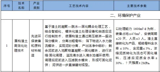 11月27日,國家發改委發布《擬納入<綠色技術推廣目錄(2024年版)> 的技術清單》。《清單》分為節能降碳、環境保護、資源循環利用、能源綠色低碳轉型、生態保護修復和利用、基礎設施綠色升級、綠色服務七個類別,共有113項技術入選,為各產業轉型升級提供了關鍵技術指引。其中,盾構渣土高效化處理技術為解決工程泥漿、盾構渣土減量化、資源化、無害化問題提供了有效途徑。